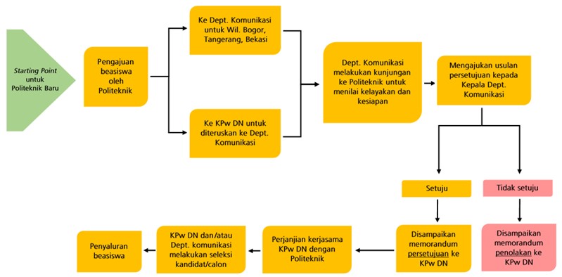 - Politeknik mengajukan surat permohonan disertai dengan proposal yang berisi antara lain : legalitas lembaga, akreditasi, jumlah program studi, jumlah dosen, beasiswa yang sudah ada, jumlah mahasiswa, jumlah mahasiswa yang sudah mendapat beasiswa dan lainnya yang diperlukan untuk proses asesmen politeknik.